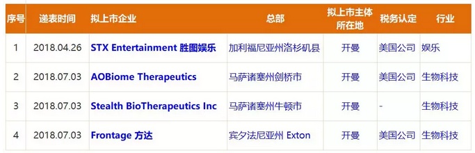 截止至2018年8月5日,已有四家总部设在美国的企业,向香港联交所递交上市申请,分别是来自美国加利福尼亚州的STX Entertainment(胜图娱乐)、马萨诸塞州的AOBiome Therapeutics和Stealth BioTherapeutics、和宾夕法尼亚州的Frontage(方达)。具体如下: