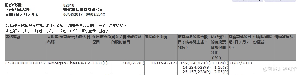 智通财经APP获悉,根据联交所资料显示,摩根大通于7月31日增持瑞声科技(02018)60万股,每股作价99.6港元,总值5976万港元,最新持股量增至13.04%。