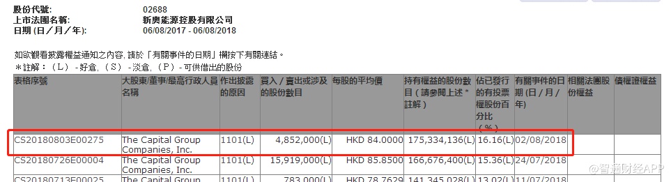 智通财经APP获悉,根据联交所资料显示,The Capital Group于8月2日增持新奥能源(02688)485万股,每股作价84元,总值4.07亿港元,最新持股数目约1.75亿股,最新持股量增至16.16%。