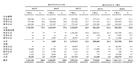 截至2015、2016、2017年12月31日止年度,光大水务分别实现收入18.15亿、24.94亿、35.92亿港元;实现毛利分别为8.24亿、9.06亿、12.3亿港元;污水处理业务线分别占收入的97.5%、97.6%、64.9%;分别占毛利的98%、96.5%、78.3%。