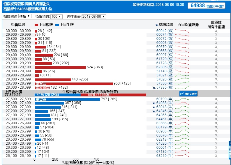 智通财经APP获悉,截至8月6日,恒指最新的牛熊街货比例为41:59。从瑞信恒指牛熊证街货分布图中得到的数据显示,熊证街货重货区在28700-28799区间,此区间最新的熊证数量为950张,比上一交易日增加123张;最多新增区间在28600-28699,新增182张。牛证中重货区在27500-27599区间,该区间最新牛证数量为797张,比上一交易日减少289张。牛证各区间张数均有减少。