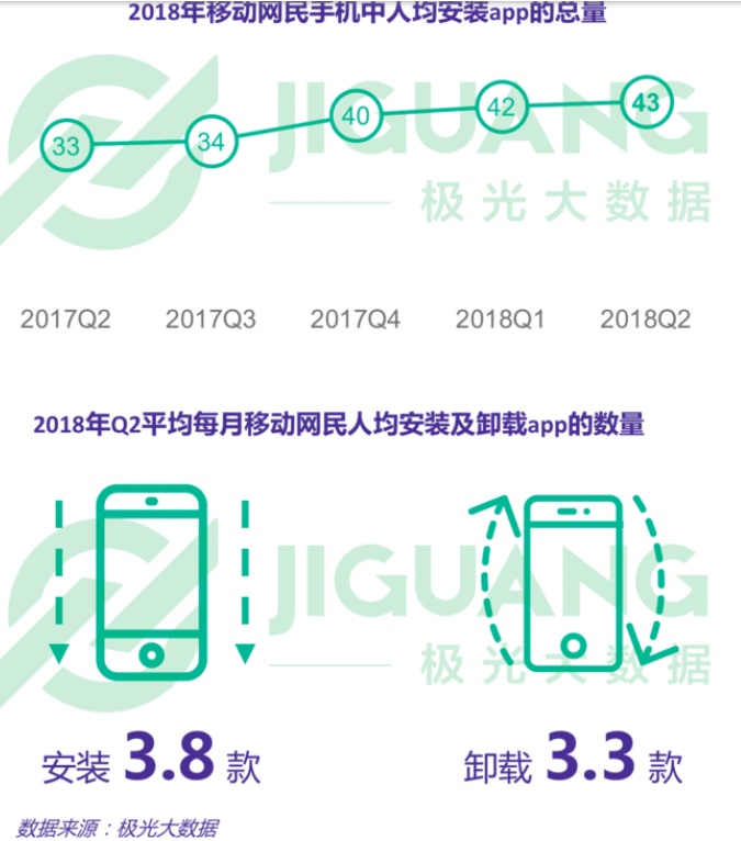 据极光大数据显示,2018年Q2,中国移动网民手机中人均安装app的总量为43个,与Q1相比略微增长;同时,2018年Q2,平均每月中国移动网民人均新装app数量为3.8款,同期卸载app数量为3.3款。
