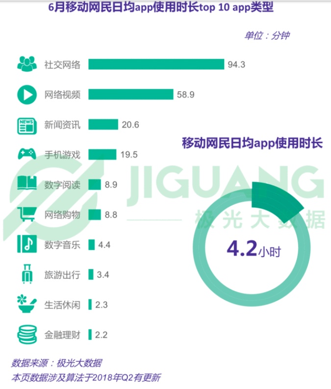 极光大数据显示,中国移动网民每日平均有4.2小时花费在手机app的使用上;其中,花费在社交网络类app的时长最长,为94.3分钟;花费在网络视频类app的时长达58.9分钟;花费在新闻资讯类app的时长为20.6分钟。