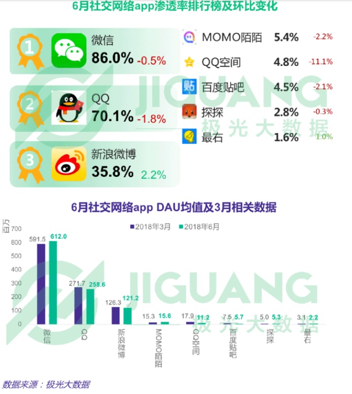 根据极光大数据显示,社交网络霸主微信6月渗透率为86.0%,相比3月降低0.5%,6月DAU均值破6亿;QQ 6月渗透率为70.1%,相比3月降低1.8%;新浪微博渗透率达35.8%,相比3月增长2.2%;最右渗透率达1.6%,相比3月增长1.0%;此外,MOMO陌陌、QQ空间、百度贴吧等社交网络app渗透率均有不同程度下降。
