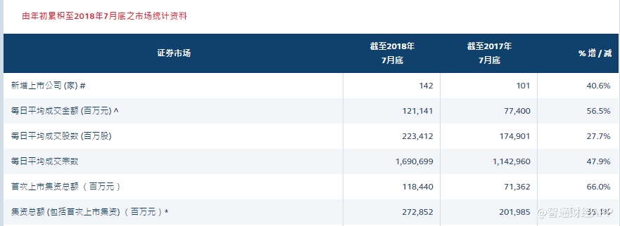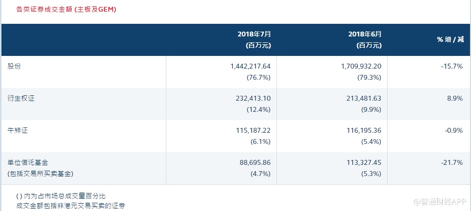 智通财经APP获悉,据港交所(00388)官方网站公布,2018年证券证券市场首七个月的平均每日成交金额为1211亿港元,同比增长56%;衍生权证平均每日成交金额为173亿港元,上升66%;牛熊证平均每日成交金额为75亿港元,上升83%。
