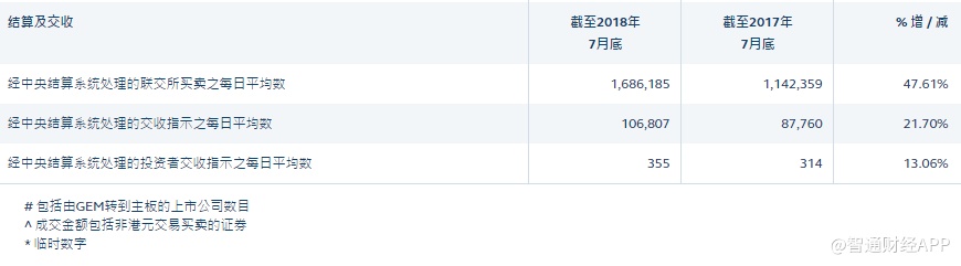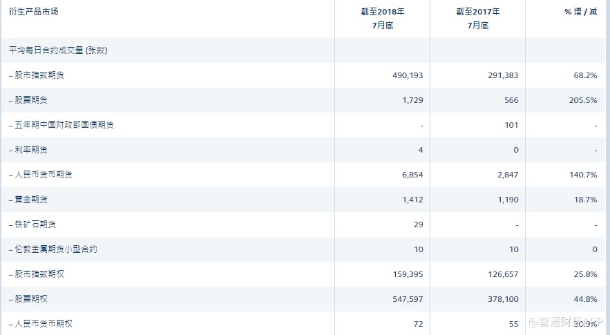 另外,衍生产品市场方面,期內期货及期权平均每日成交量为1,207,294张合约,上升51%;股市指数期货平均每日成交量为490,193张合约,上升68%;股市指数期权平均每日成交量为159,395张合约,上升26%;股票期权平均每日成交量为547,597张合约,上升45%;人民币货币期货平均每日成交量为6,854张合约,上升141%;美元兑人民币(香港)期货成交亦于2018年7月3日创下21,686张合约的历史新高。2018年7月及20日及31日,人民币货币期权 - 美元兑人民币(香港)期权的成交及未平仓合约分別创下1,127张及6,043张合约的历史新高。
