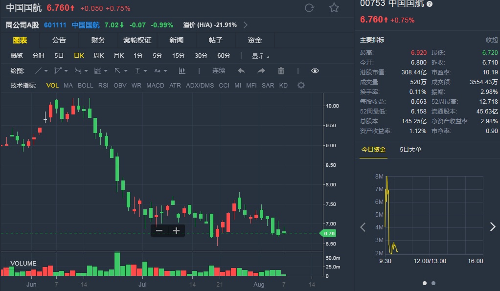 截至8月7日,中国国航(00753)涨0.75%,报6.76港元。