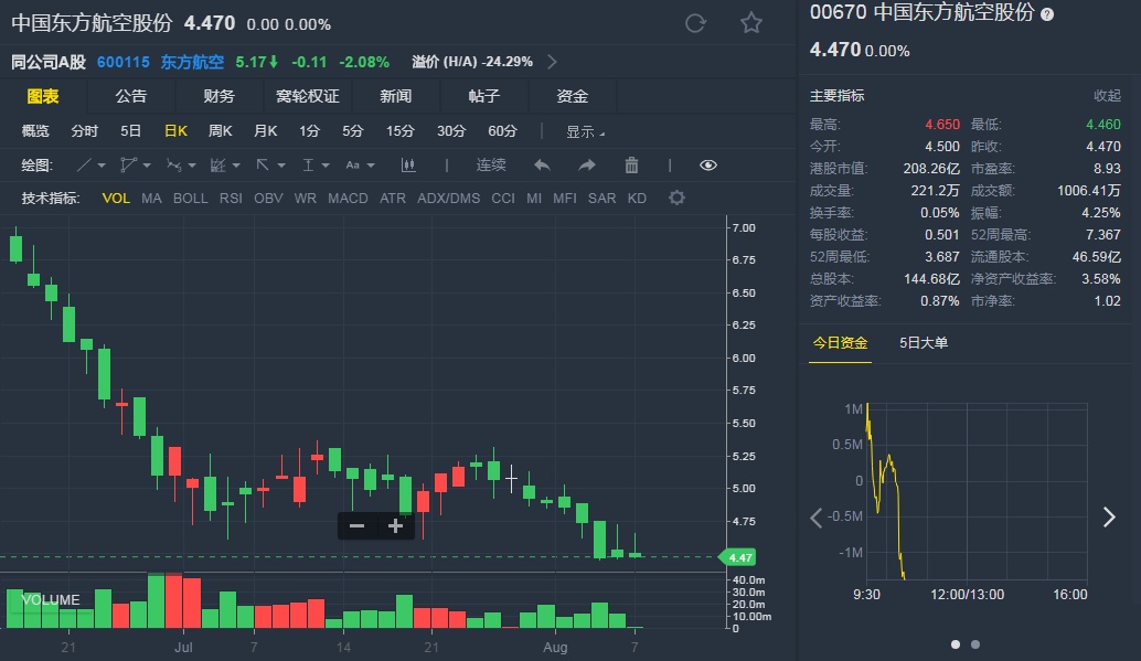 截至8月7日,东方航空(00670)跌2.08%,报4.47港元。