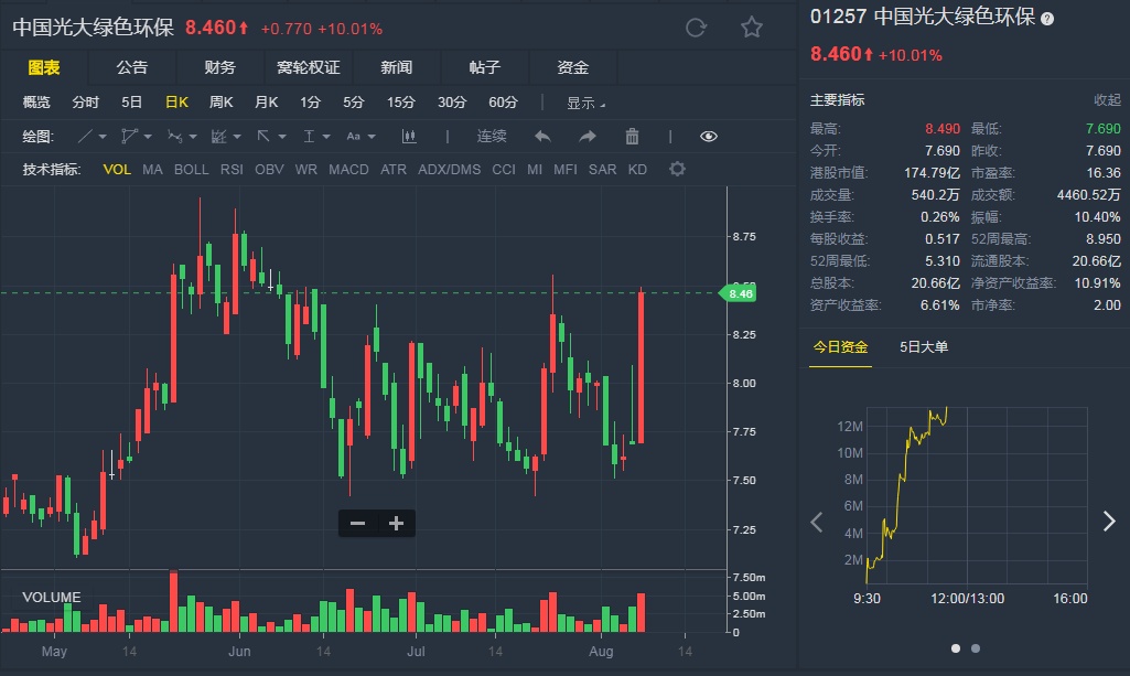 截至8月7日,中国光大绿色环保(01257)涨10.01%,报8.46港元。