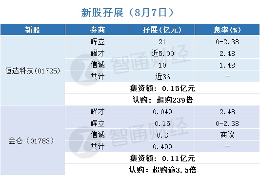 截至8月7日,正在招股的新股中,辉立、耀才、信诚3家券商为恒达科技(01725)借出孖展金0.15亿港元,超购239倍。