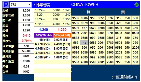 智通财经APP获悉,中国铁塔(00788)将于下一交易日挂牌,上市前夕,据辉立交易场资料显示,中国铁塔暗盘开市报1.26元,与招股价持平。收报1.25元,较招股价跌0.794%,每手2000股,不计手续费,每手亏20元。