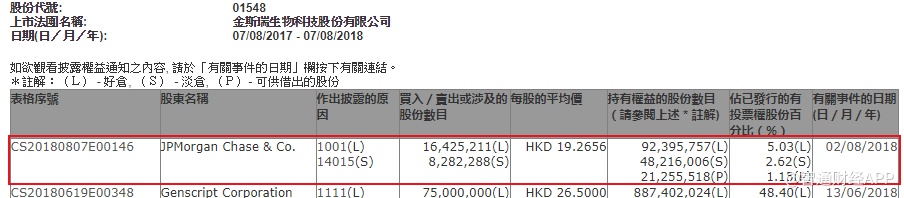 摩根大通增持金斯瑞生物科技(01548)1643万股,每股作价19.27元