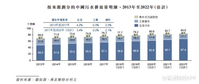 城镇化是导致市政污水排放量增加的主要因素之一,根据弗诺斯特沙利文数据统计,自2017-2022年,预计生活污水排放量将以3.4%的复合年增长增长,与之相反,随着政府持续推进工业节水及工业废水零排放项目,预计工业废水排放量将于2022年进一步下降至171亿吨。