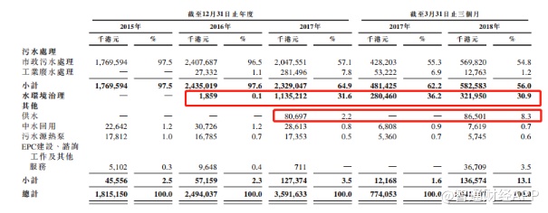 招股书显示,2015-2017年污水处理业务分别占到收益的97.5%、97.6%及62.2%,截止2018年3月32日,其污水处理业务占总收益比为56%,较2017年同期的62.2%进一步下降。
