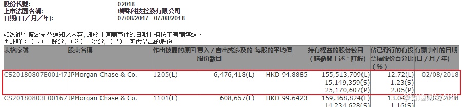 摩根大通减持瑞声科技(02018)648万股,每股作价94.89元