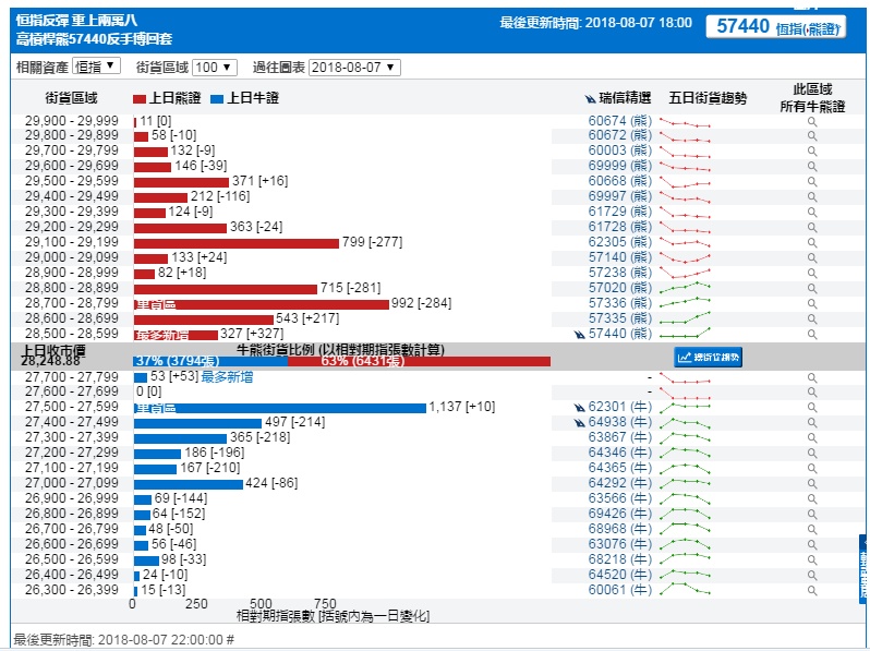 智通财经APP获悉,截至8月7日,恒指最新的牛熊街货比例为37:63。从瑞信恒指牛熊证街货分布图中得到的数据显示,熊证街货重货区在28700-28799区间,此区间最新的熊证数量为992张,比上一交易日减少284张;最多新增区间在28500-28599,新增327张。牛证中重货区在27500-27599区间,该区间最新牛证数量为1137张,比上一交易日增加10张。最多新增区间在27700-27799,新增53张。
