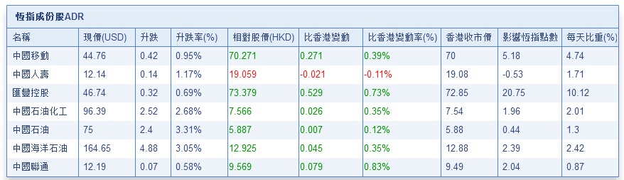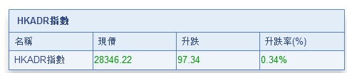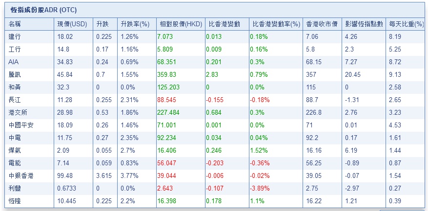 智通财经APP获悉,港股ADR指数高开高走,尾盘涨幅有所缩窄,截至8月7日美股收盘,按比例计算,收报28346.22点,升97.34点或0.16%。主要蓝筹收涨,汇丰控股收报73.379元,较港收市升0.529元;腾讯控股收报359.83元,较港收市升2.83元。港交所收报227.484元,较港收市升0.684元。