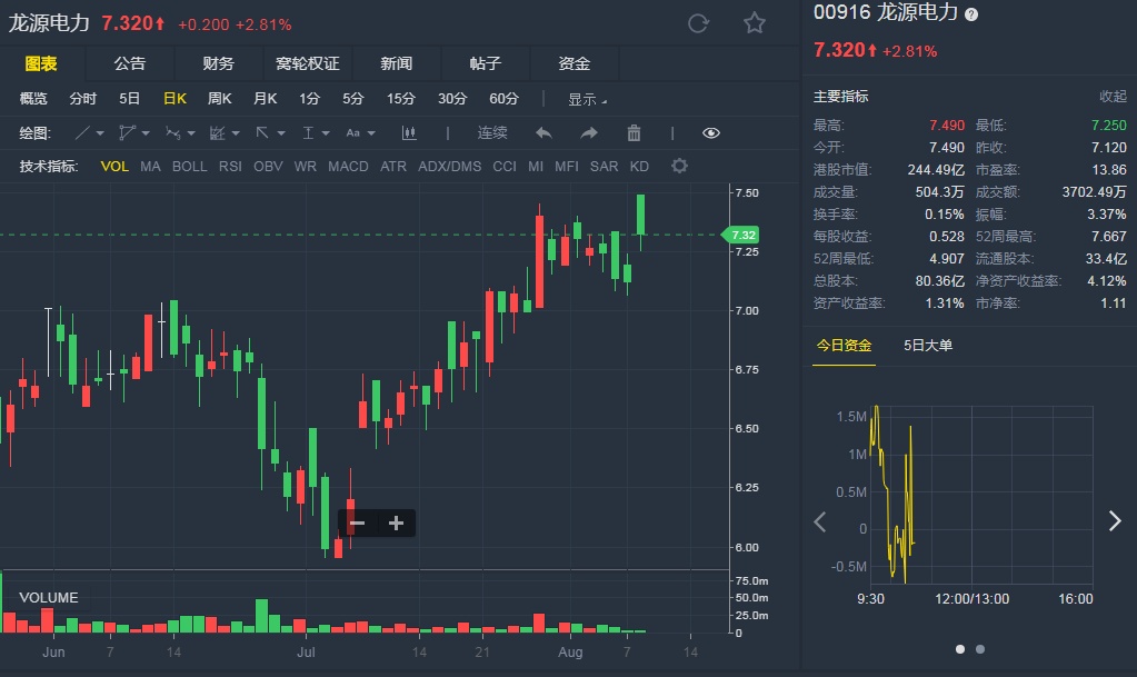 截至8月7日,龙源电力(00916)涨2.81%,报7.32港元。