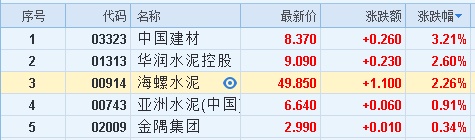 华润水泥(01313)涨2.60%报9.09港元,海螺水泥(00914)涨2.26%。