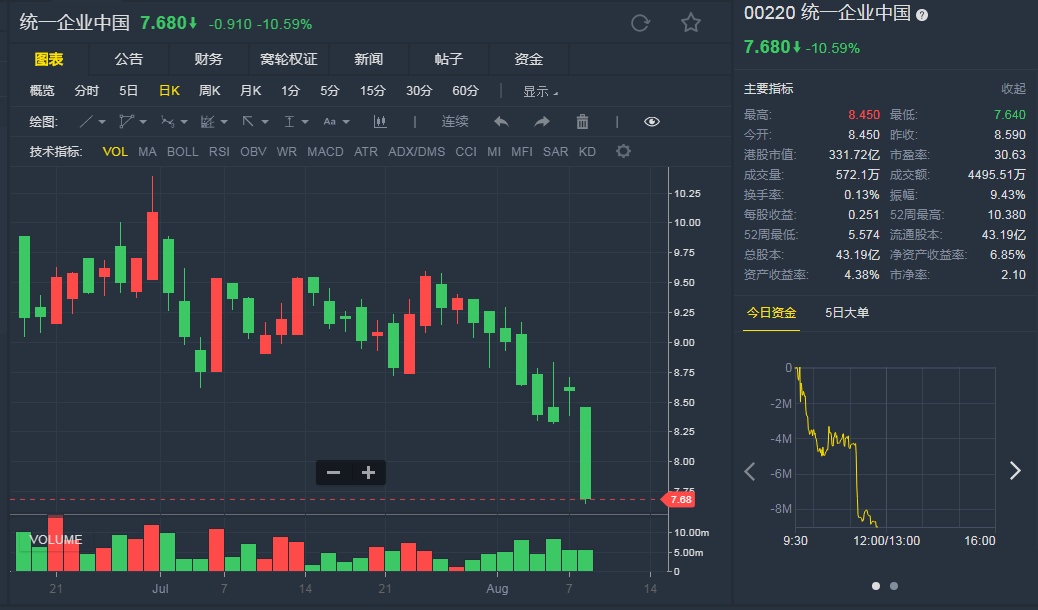 截至8月7日,统一(00220)跌10.59%,报7.68港元。