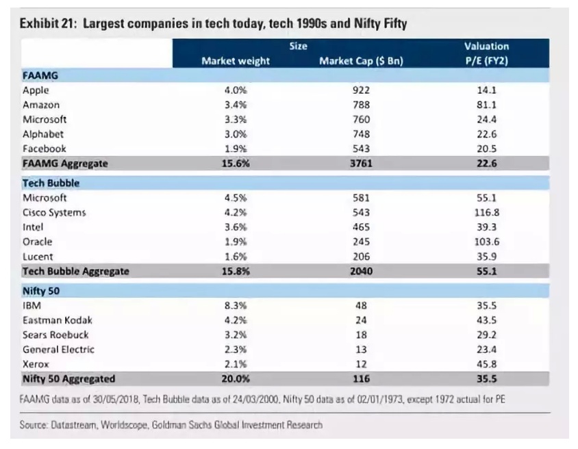 而以高盛为代表的乐观派却认为,与此前两轮科网泡沫相比,现在的科技股根本不存在泡沫。