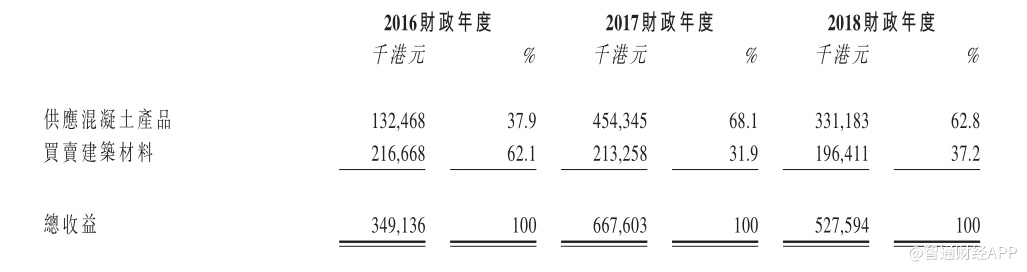 2016、2017、2018财年度,文辉发展集团分别实现收入3.49亿、6.68亿、5.28亿港元。其收益主要来自以要求新及现有客户提供方案或报价的方式:1.供应混凝土产品;2.买卖建筑材料。