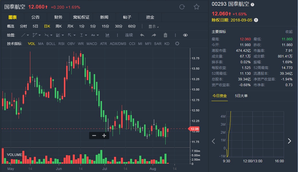 截至8月9日,国泰航空(00293)涨1.69%,报12.06港元。