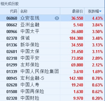 智通财经APP获悉,保险股全线走强,截至14时54分,众安在线(06060)涨4.43%,报36.55港元,中国太平(00966)、保诚(02378)、新华保险(01336)、中国太保(02601)均涨逾3%,中国平安(02318)涨2.89%,友邦保险(01299)涨1.98%。
