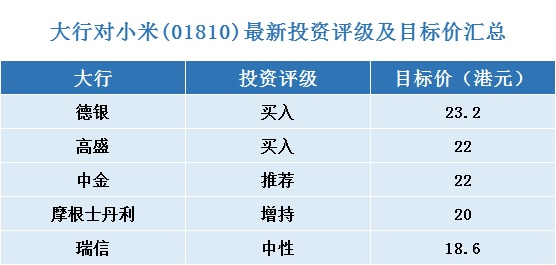 智通财经APP获悉,在上个月首度公开发行(IPO)之后的强制静默期结束后,小米的联席保荐人摩根士丹利和高盛都建议买进小米,参与了小米上市案的中金分析师也给予“推荐”评级,德银更是直接给予目标价23.2元,较现价有20%的上涨空间。瑞信虽然给予“中性”评级,但仍预测小米上看18.6港元,较现价高。