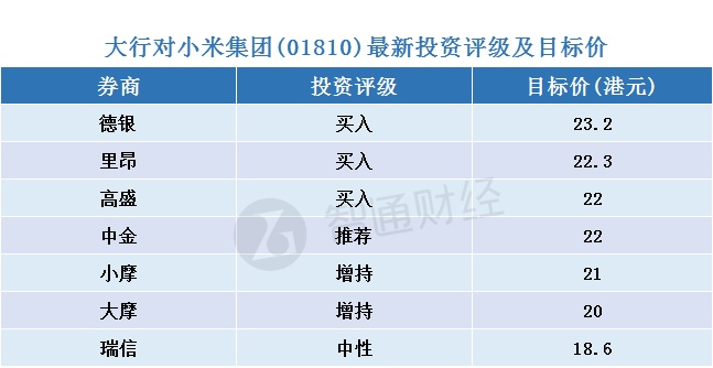智通财经APP获悉,小米集团(01810)今日早市股价弹高5.5%收18.08元,7间大行对其发出研究报告现列出各行对其最新投资评级及目标价。