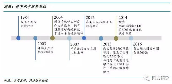 2013年收购柯尼卡美能达光学仪器(上海)有限公司:得到了柯尼卡美能达从光学设计、工程、制造、品质保证等全方面的现场技术派员指导,同时又获得了柯尼卡美能达手机镜头相关的技术专利。