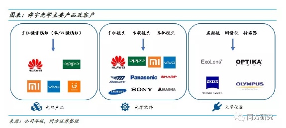 舜宇光学作为国内领先的光学器件生产商,产品覆盖手机、汽车、数码相机、光学仪器等多个领域,主要客户包括华为、小米、OPPO、三星、索尼、奥林巴斯等。