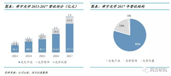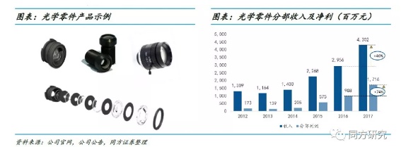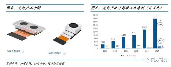 公司业务由三大分部组成:光电产品业务进行手机摄像头模组封装,位于产业链中游,2017年收入占比79%;光学零件业务主要是手机镜头、车载镜头及其他光学镜头制造,位于行业上游,产品附加值较高,对公司利润贡献最大;光学仪器分部收入占比约1.3%,目前对整体业绩表现影响很小。