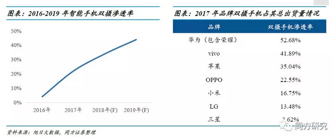 2017年全球智能手机出货量近10年来首次零增长,标志着智能手机行业已经从增量时代转入存量时代。随着终端品牌之间的竞争转入下半场,手机摄像能力的提升成为了吸引消费者眼球的重要手段,“双摄”也逐渐成为了高端机型的标配,并开始向中低端机型渗透。