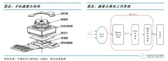 摄像头模组(CCM)成像的工作原理是:光线透过镜头及滤光片,照射在CMOS传感器上,再由传感器将光信号转化为电信号,之后进一步转化为数字信号送至手机处理器转换成图像。