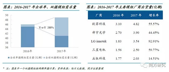 如前文所述,出于对算法和工艺精密度的要求,双摄已经成为了一、二线模组厂商的分水岭。2017年前十大模组厂商占据了全球超过50%市场份额,较2016年同比增长13%,集中化趋势越发明显。据旭日大数据统计,2017年双摄需求量增幅约288%,拉动手机摄像头模组出货量快速增长。