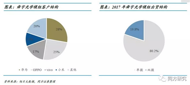 2017年,舜宇光学的双摄出货量占比较欧菲科技和丘钛科技有显著优势,在双摄的应用上最为激进的华为是公司最大的摄像头模组客户。2017年华为占总出货量的28%、OPPO占25%、小米占11%、vivo占17%、其他手机品牌占其20%。