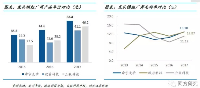 通过我们对多个渠道的调研,舜宇目前在高端品牌中的认可度仍略低于大立光,但品质已经比较接近。虽然公司尚未打入苹果产业链,但在安卓手机品牌中已有较高认可度。公司2018年已经开始向三星S9供应镜头,是中国光学厂商首次打入三星高端机型供应链,随着公司产品结构部不断优化,相信毛利率和单价都会有一定提升。