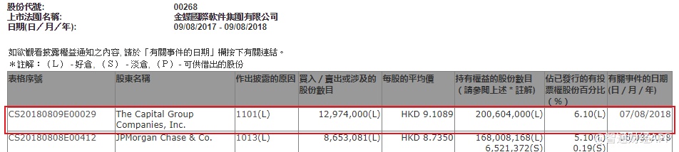 智通财经APP获悉,根据联交所股权变动资料显示,The Capital Group于8月7日增持金蝶国际(00268)1297万股,每股作价9.1089元,总值1.18亿港元,最新持股量增至6.10%。