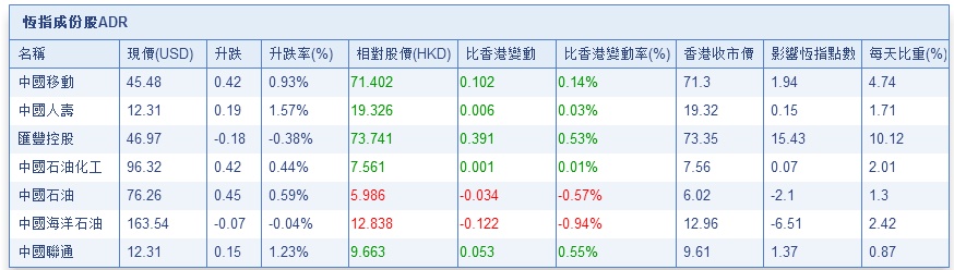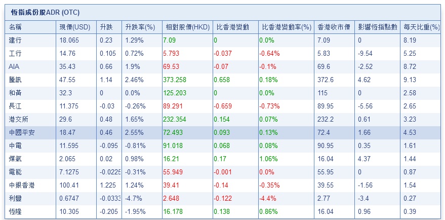 智通财经APP获悉,港股ADR平收。截至8月9日美股收盘,按比例计算,收报28607.76点。主要蓝筹靠稳,汇丰控股收报73.74元,较港收市升0.39元;腾讯控股收报373.26元,较港收市升0.66元。