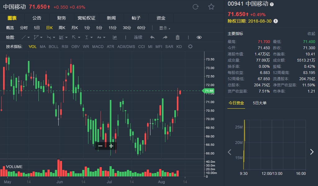 截至8月10日,中移动(00941)涨0.49%,报71.65港元。