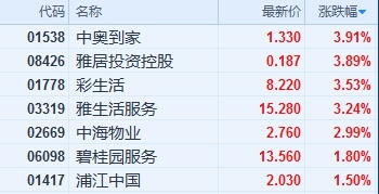 智通财经APP获悉,于2018年8月10日,内房股全线飙升,物管股随市造好,中奥到家(01538)一度拉升逾6%。截至10:08,中奥到家、雅居投资控股(08426)涨近4%,彩生活(01778)及雅生活服务(03319)均涨逾3%。