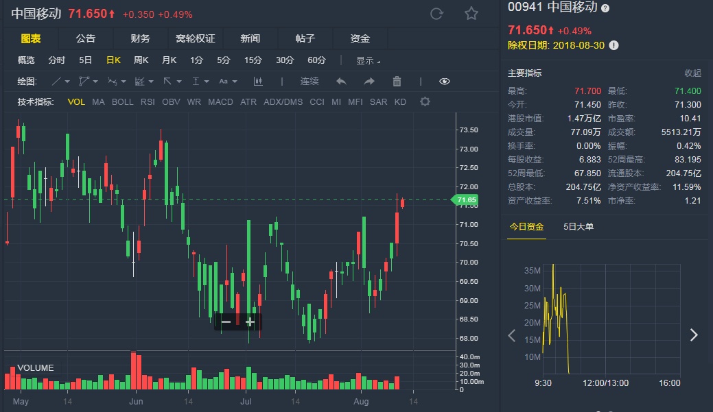 截至8月10日,中移动(00941)涨0.49%,报71.65港元。