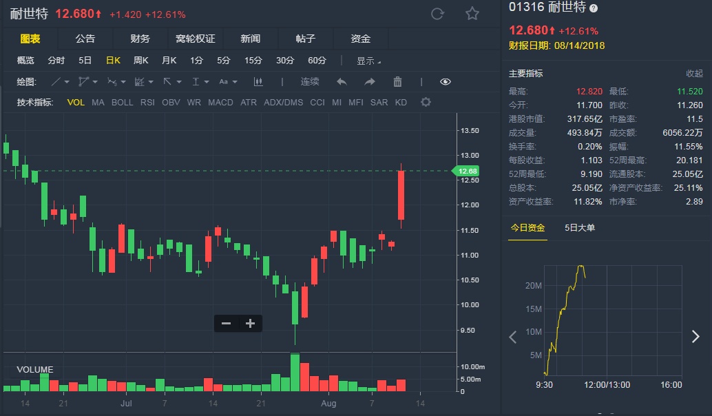 截至8月10日,耐世特(00941)涨12.61%,报12.68港元。