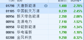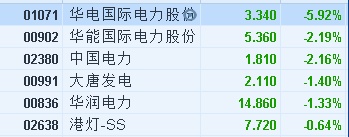 智通财经APP获悉,电力板块全线下挫,截至11时29分,华电国际(01071)跌5.92%,报价3.34港元,华能国际(00902)跌2.19%,报5.36港元,中国电力(02380)跌2.16%,报1.81港元,大唐新能源(01798)跌2..78%,报1.4港元。