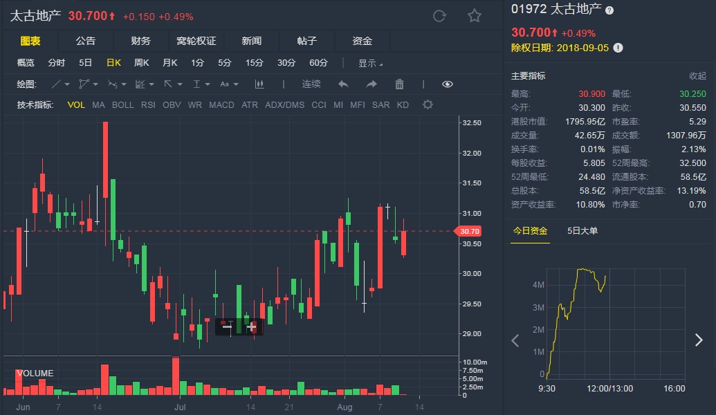截至8月10日,太古地产(01972)涨0.49%,报30.7港元。