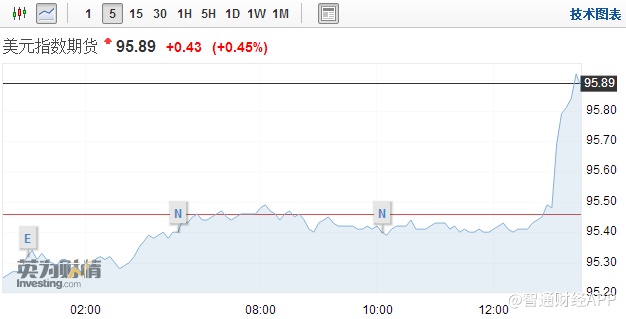 智通财经APP获悉,美元指数期货日内走高,一度逼近96关口,涨0.5%,最高报95.92。截至发稿,美元指数报价95.89,涨0.43或0.45%。