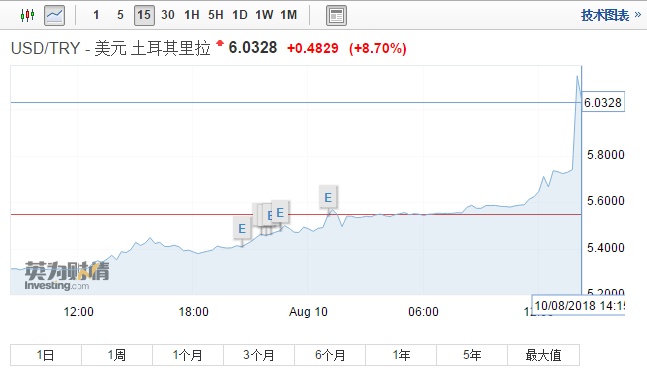 智通财经APP获悉,土耳其里拉兑美元跌幅扩大至逾13%,续刷历史新低,最低至6.1428。截至北京时间14:23分,跌幅有所收窄。土耳其里拉兑美元跌8.7%,报6.0328。