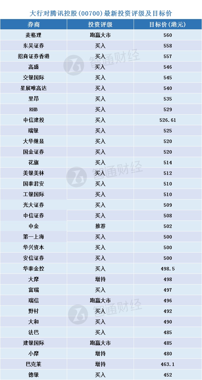 智通财经APP整理,大行对腾讯控股(00700)最新投资评级及目标价如下: