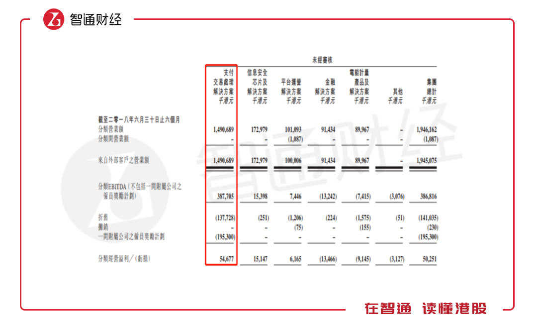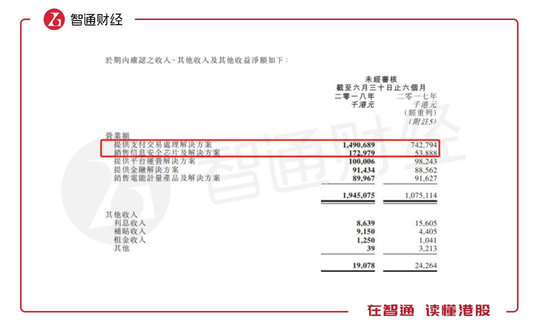 高阳科技的收入增长了81%,而该公司的收入构成中,主要包括了五大产品,即提供支付交易处理解决方案、销售信息安全芯片、提供平台运营方案、提供金融解决方案以及销售电能计量产品,其中核心收入是支付交易处理解决方案,上半年收入14.9亿港元,收入占比76.6%。